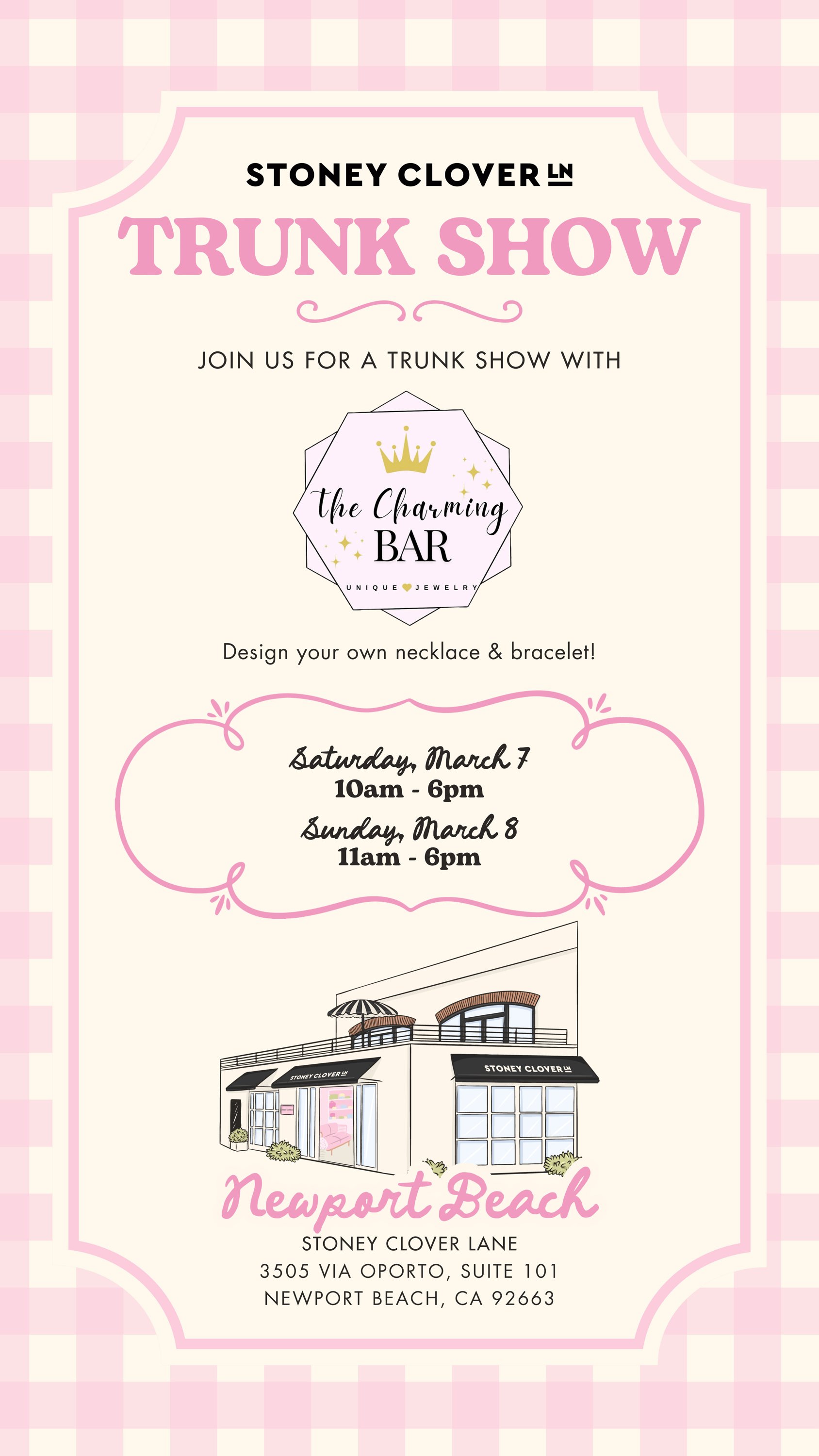 Join Stoney Clover Lane for a Trunk Show with The Charming Bar. Stop by to design your own necklace and bracelet.