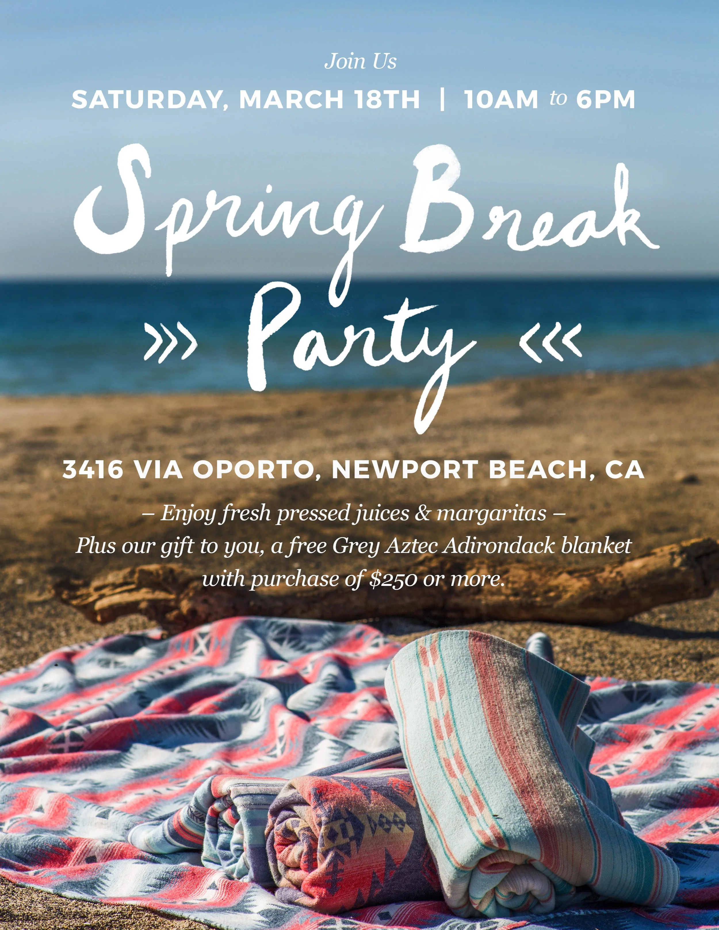 Join Faherty and celebrate Spring Break with fresh pressed juices and margaritas! Spend $250 or more and receive a free Grey Aztec Adirondack blanket.