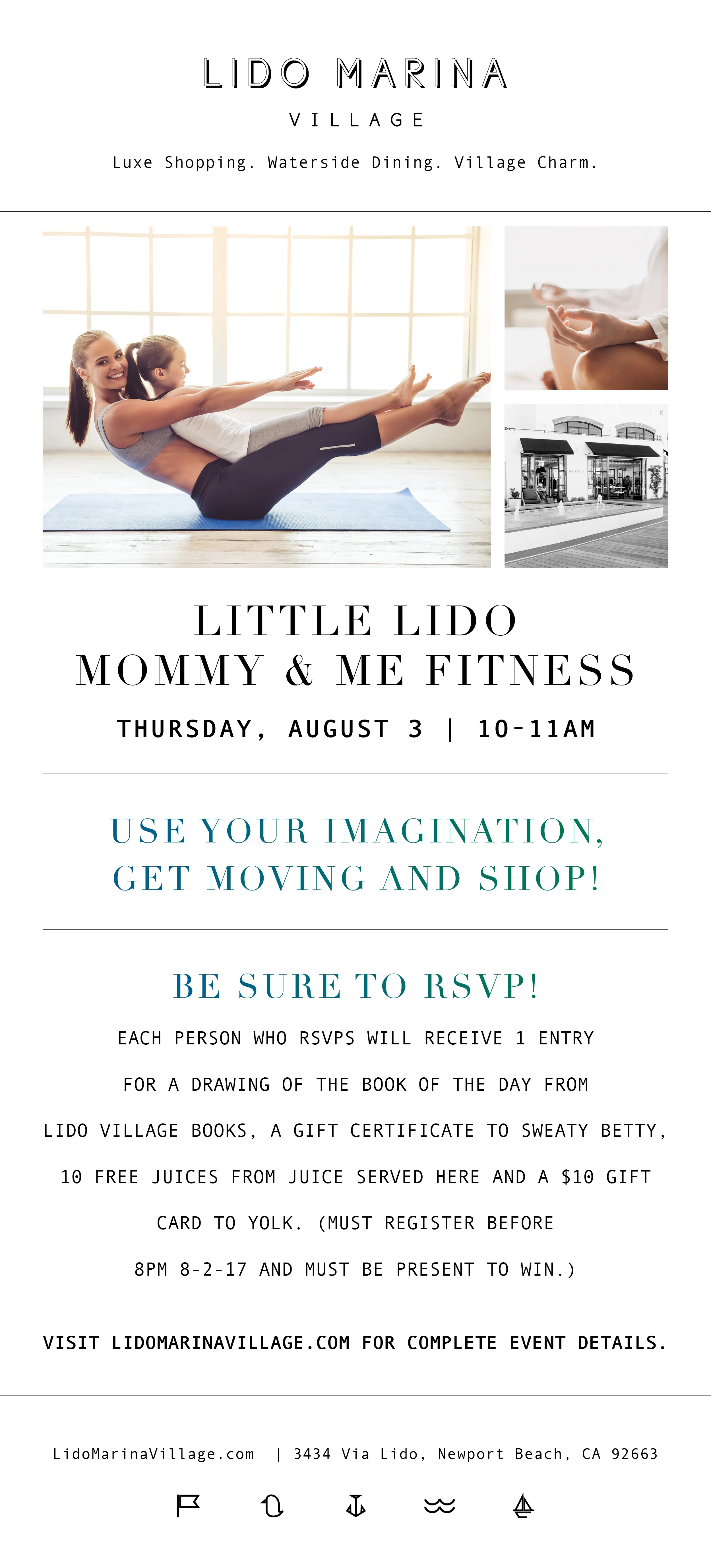 You're invited to to Lido Marina Village Kids Club on Thursday, August 3rd from 10am-11am at Lido Village Books. Bring your children and enjoy a reading of a book about yoga followed by a Mommy and Me Fitness class with Curl Fitness. Moms will love the raffle prizes from participating Lido Marina Village retailers.