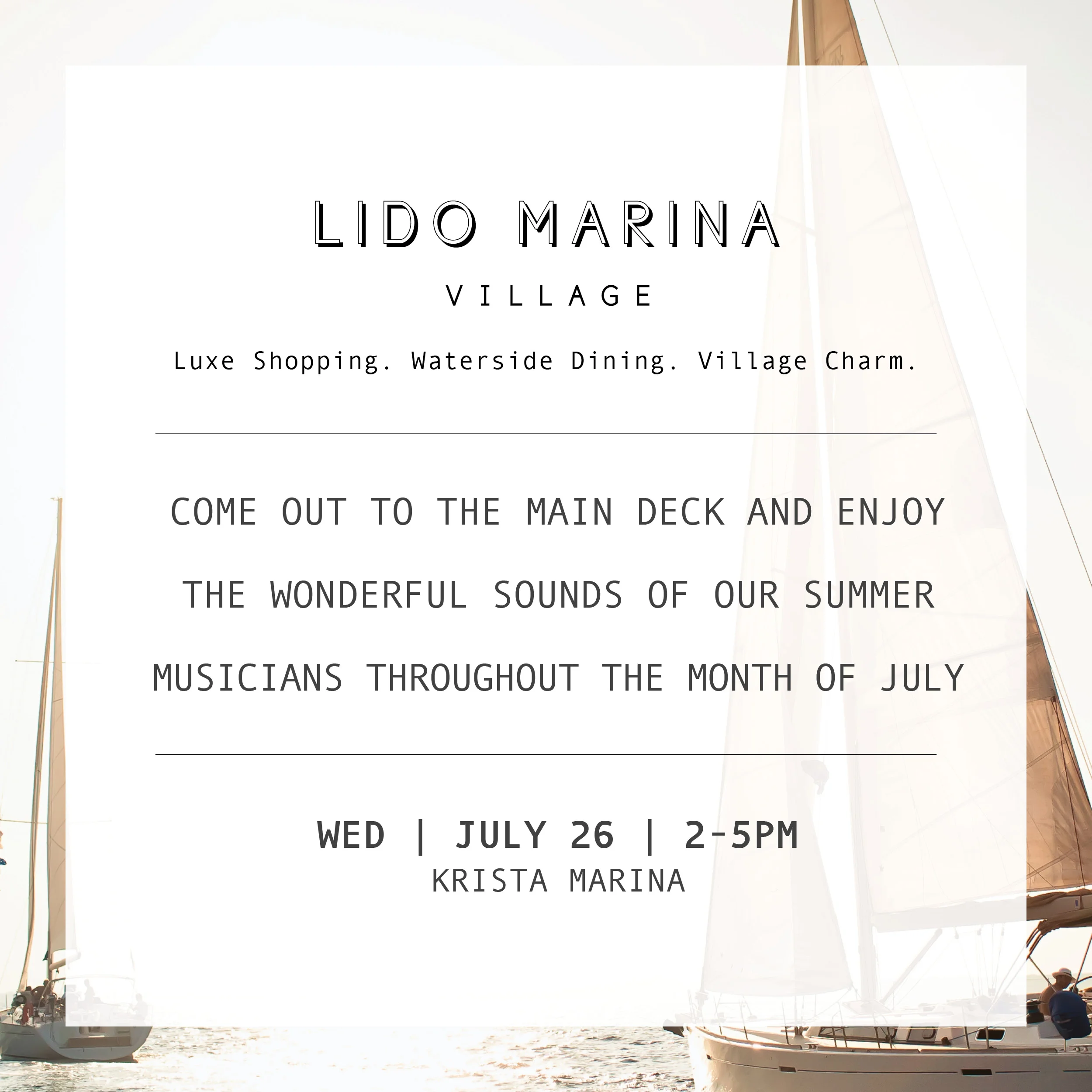 Relax and enjoy the sweet melodies of summer with live music on the main deck from 2-5pm. Soak up the sun and sea air while enjoying performances from our talented lineup of musicians. Performing July 26: Krista Marina.