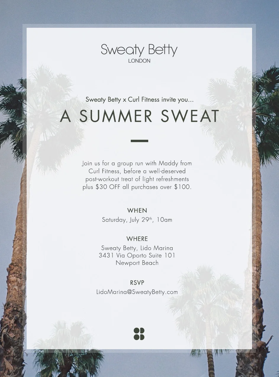 Join Sweaty Betty and Curl Fitness for a group run with Maddy from Curl Fitness, before a well deserved post workout treat of light refreshments plus $30 off all purchases over $100.
