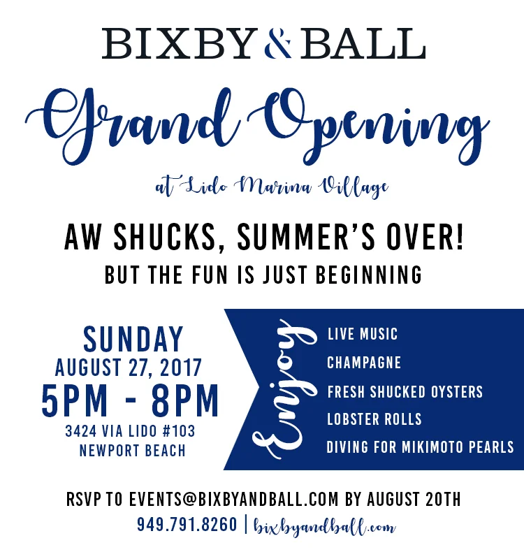 It’s time to kick back, relax and slurp on your favorite briny bivalves at Bixby & Ball’s ‘Aw Shucks, Summer’s Over!’ grand opening celebration. This end-of-summer reception is sure to be a feast for the senses with authentic flavors, lively sounds and bubbly to toast with of course! Summer may be over, but the fun is just beginning!