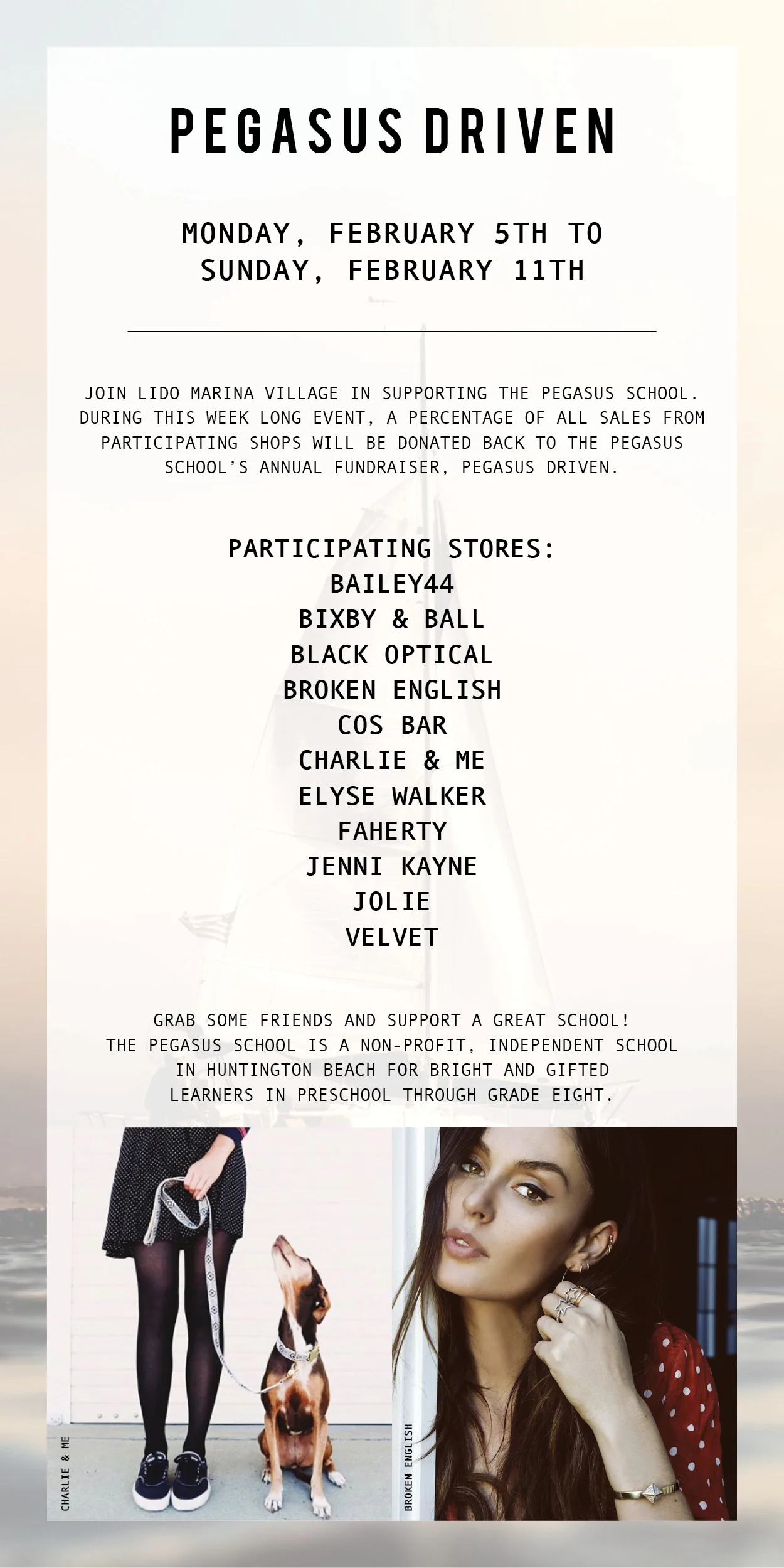 Join Lido Marina Village in supporting the Pegasus School. During this week-long event, a percentage of all sales from participating shops will be donated back to the Pegasus School’s annual fundraiser, Pegasus Driven.