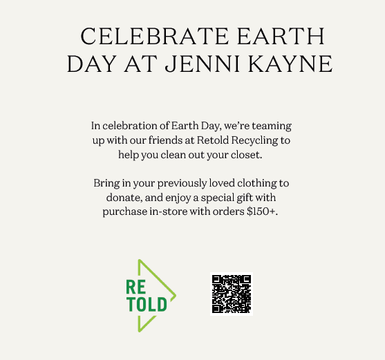 In celebration of Earth Day, Jenni Kayne is teaming up with Retold Recycling to help you clean out your closet. Bring in your previously loved clothing to donate, and enjoy a special gift with purchase in-store with orders $150+.